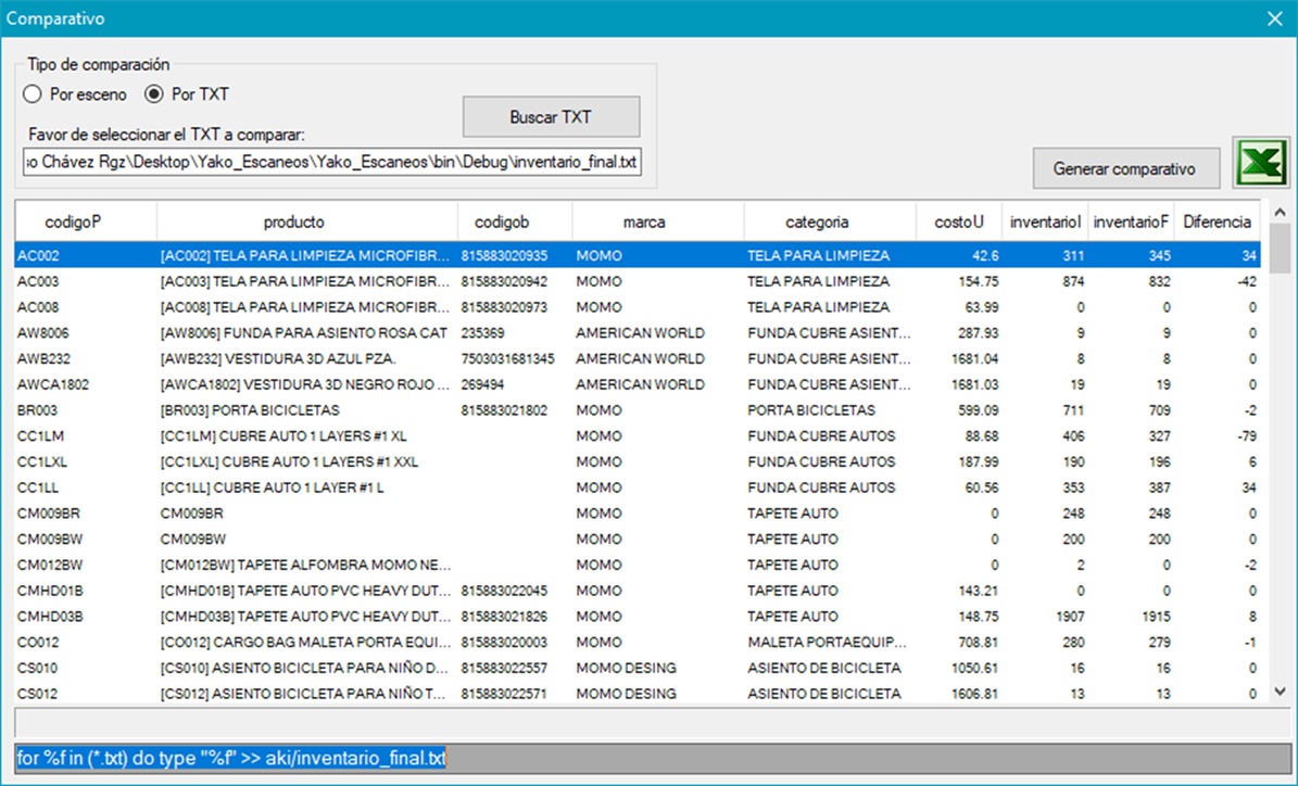 * Generación de comparativo entre Inventario inicial y final